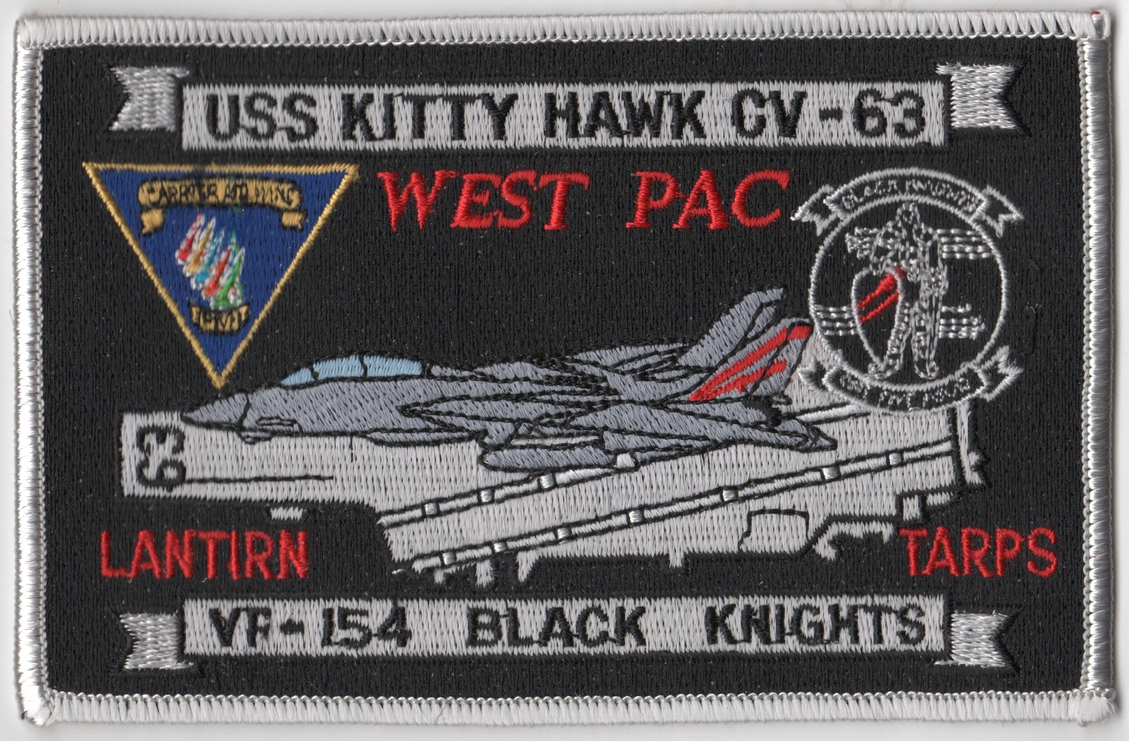 This is the WestPac cruise patch for the VF-154 Black Knights attached to Airwing 5 onboard the USS Kitty Hawk (CV-63). It also shows the Tomcat’s capability with the LANTIRN and TARPS.