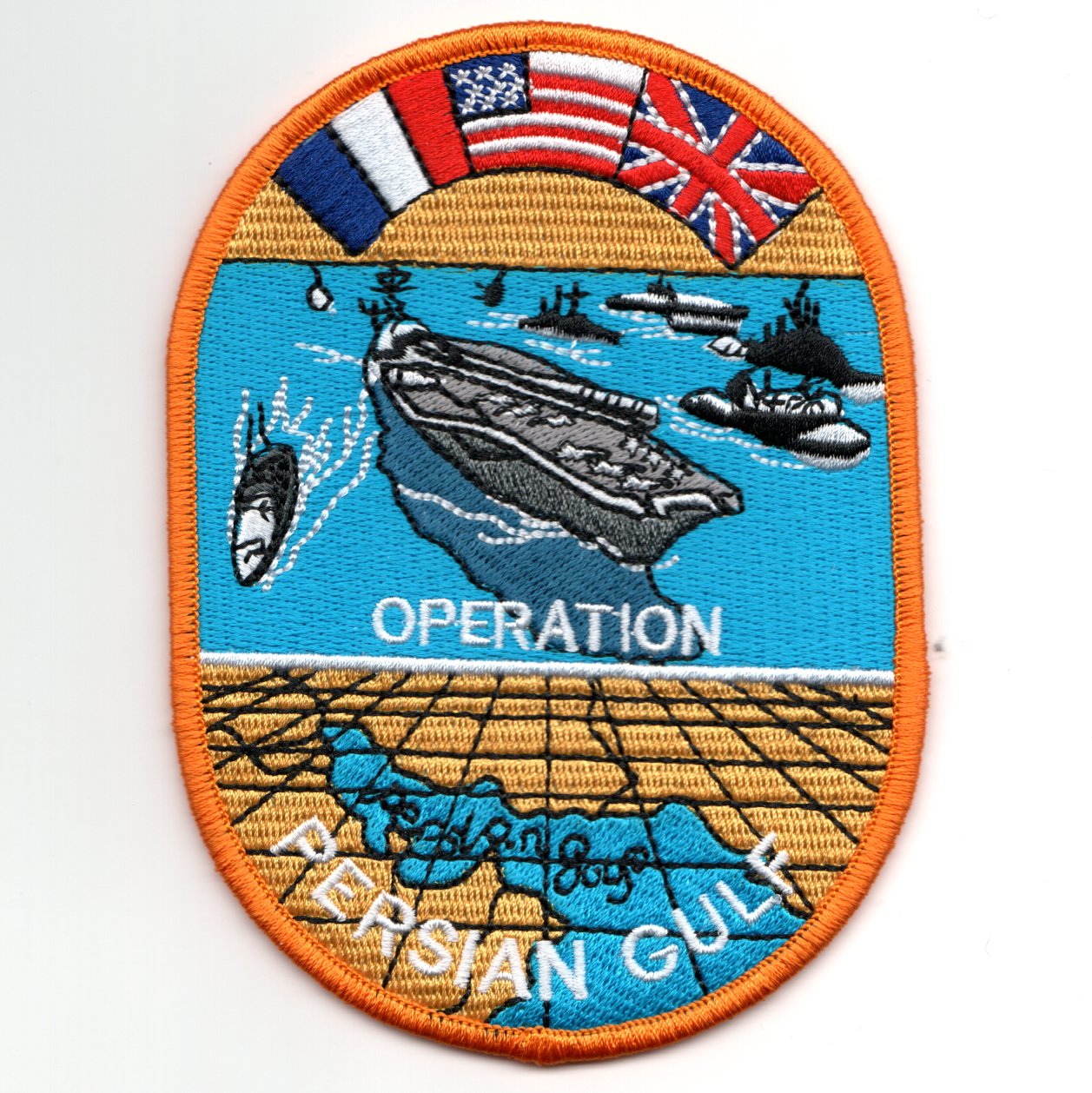 This is one of the cruise patches for CV-64 for their 1994/1995 WESTPAC cruise. This one shows their Area Of Responsibility (AOR) being the PERSIAN GULF. It depicts the entire Battle Group (that’s what it was called back then) and if you look closely, there is cursive writing that says PERSIAN GULF in the actual Persian Gulf!! This patch does not come with velcro attached.