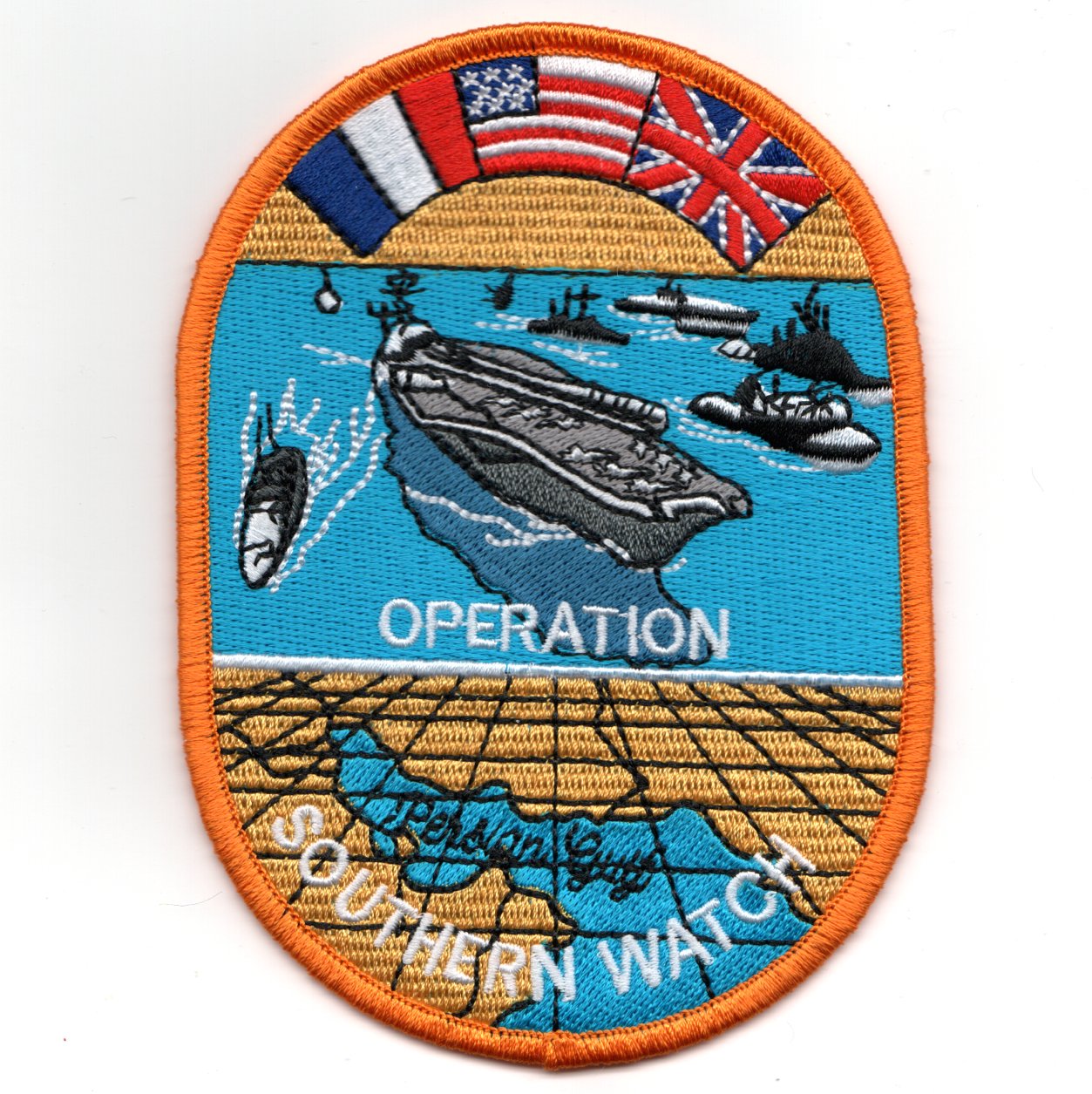 This is one of the cruise patches for CV-64 for their 1994/1995 WESTPAC cruise. This one shows their participation in Operation SOUTHERN WATCH. It depicts the entire Battle Group (that’s what it was called back then) and if you look closely, there is cursive writing that says PERSIAN GULF in the actual Persian Gulf!! This patch does not come with velcro attached.