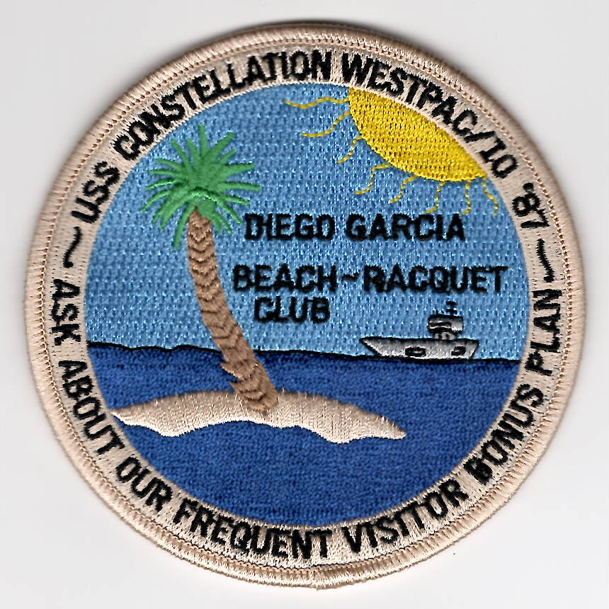 (Found in a collection): This is one of the cruise patches created for the USS Constellation (CV-64) and Airwing 2 (CVW-2) for their 1987 Western Pacific (WESTPAC) tour. It says “”””DIEGO GARCIA BEACH – RACQUET CLUB”””” (center) and “”””ASK ABOUT OUR FREQUENT VISITOR BONUS PLAN”””” (Bottom). Picked up in a recently acquired collection in VERY LIMITED quantities. This patch does not come with velcro.
