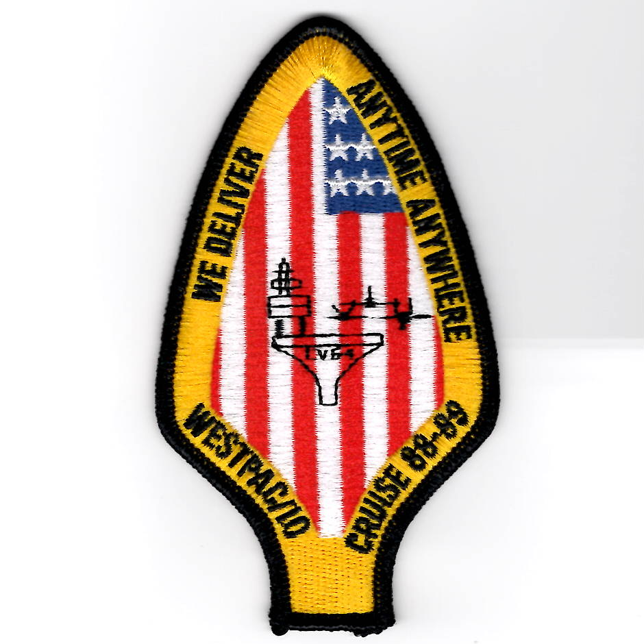 (Found in a collection): This is one of the cruise patches created for the USS Constellation (CV-64) and Airwing 2 (CVW-2) for their 1988-89 Western Pacific/INDIAN Ocean (WESTPAC/IO) tour. It says “WE DELIVER, ANYTIME ANYWHERE” (top) and shows the Carrier on the American Flag in the center. Picked up in a recently acquired collection in VERY LIMITED quantities. This patch does not come with velcro.