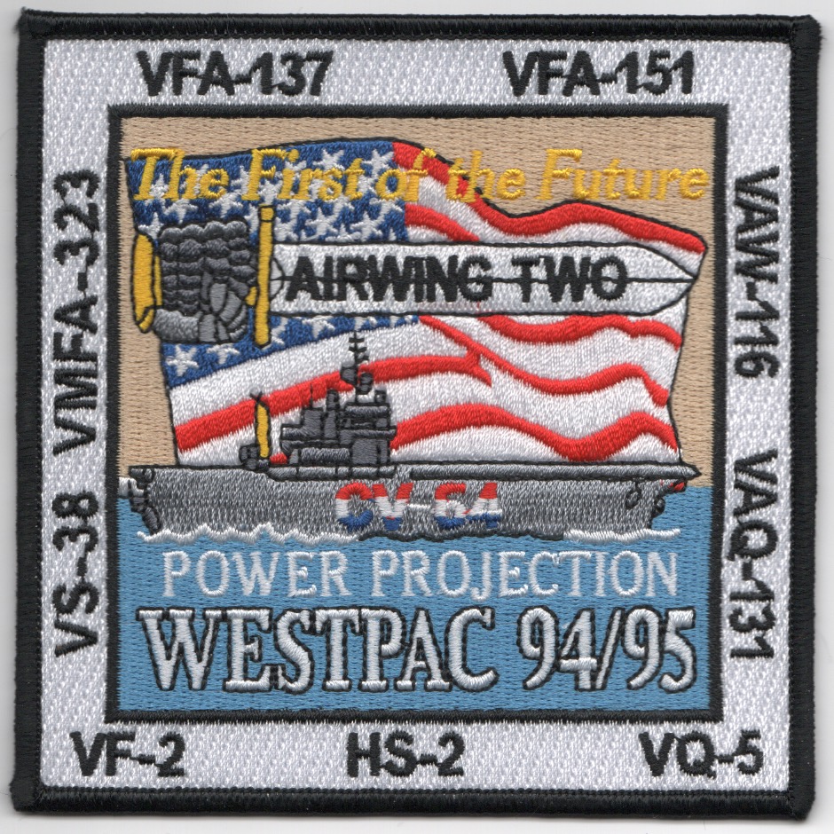 This is one of the 1994/1995 WestPac cruise patches for the USS Constellation (CV-64) and Airwing 2 (CVW-2). This patch says “The FIRST of the FUTURE” at the top, “Power Projection” along the bottom, and has the list of all the squadrons along the square border. It does not have velcro attached and is an exact reproduction of the original patch that AV8RSTUFF was asked to make for one of the groups, and was allowed to make a few extra for the site!!