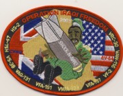This is a cruise patch for CV-64 2003 Operation Iraqi Freedom. It shows Saddam catching a bomb in the gut that reads Shock-n-Awe. It has the country of Iraqi in the background along with the Union Jack and the Stars and Stripes. This patch does not come with velcro attached.