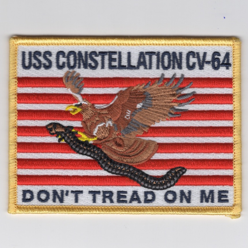 This is the color version of the famous “Don’t Tread on Me” flag worn on the flight suit sleeve by those who served onboard USS CONSTELLATION (CV-64). A few years ago, a directive from the US Navy was released that these are now an authorized flag that can be worn on their flight suits (unconfirmed). This patch does not come with velcro attached.