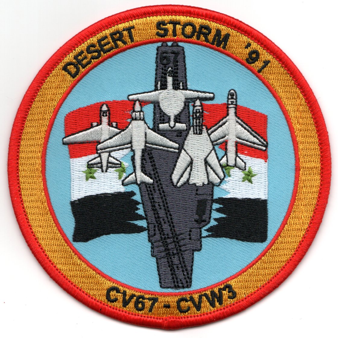 This cruise patch was also part of CV-67’s 1990/1991 cruise with CVW-3 before sailing to the Red Sea for the onset of Operation DESERT STORM. It shows Airwing 3 sailing through the Iraqi Flag with the different aircraft in the Airwing over the ship. This patch does not have velcro attached.