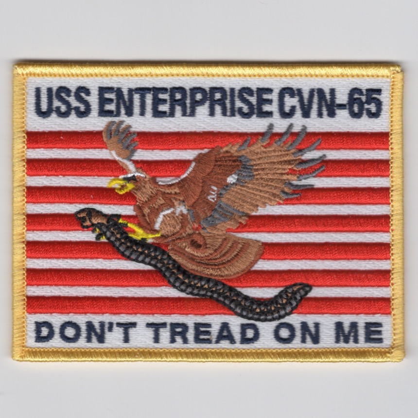 This is the color version of the famous “Don’t Tread on Me” flag worn on the flight suit sleeve by those who served onboard USS ENTERPRISE (CVN-65). A few years ago, a directive from the US Navy was released that these are now an authorized flag that can be worn on their flight suits (unconfirmed). This patch does not come with velcro attached.