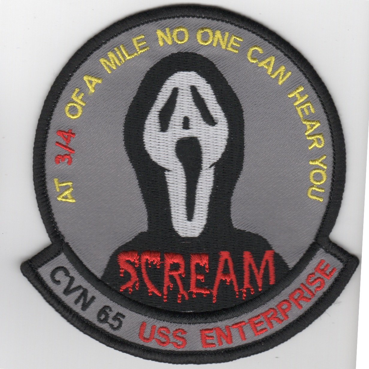 This patch is from CVN-65 and says “AT 3/4 OF A MILE, NO ONE CAN HEAR YOU SCREAM” along the top. Having been there, I laugh hysterically at the thought of this patch and what all the others were doing in the same place! This patch does not have velcro already attached.