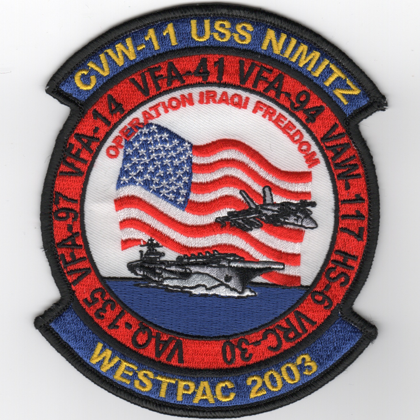 This is the cruise patch for CVW-11 while attached onboard the USS Nimitz (CVN-68). This is their “”””2003 OIF WestPac”””” patch they made showing the American Flag flying over the carrier.