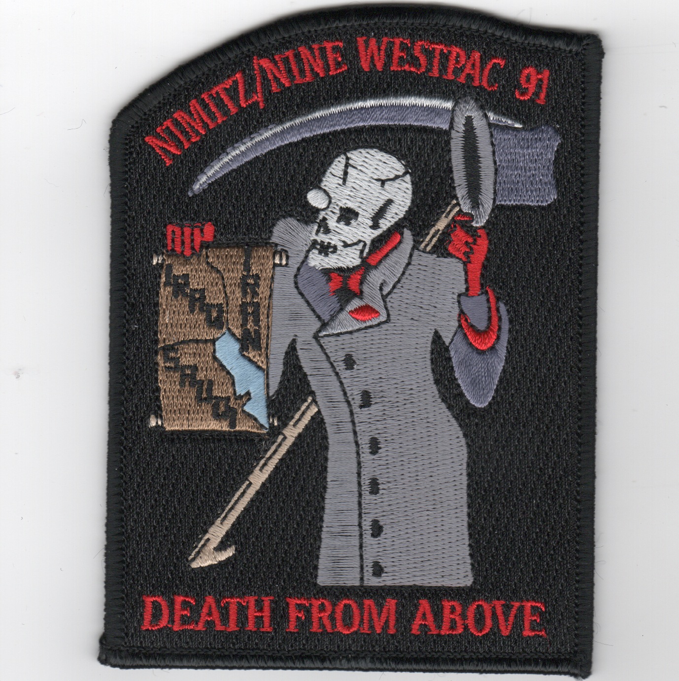 This is one of the 1991 WestPac cruise patches created for CVN-68/CVW-9 and says “”””Death From Above”””” along the bottom of the patch and shows the Grim Reaper holding a map of the Persian Gulf countries……this patch does not come with velcro already attached.