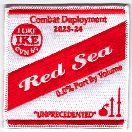 This is one of the cruise patches created for the squadrons of Carrier Air Wing Three (CVW-3) for their 2023-2024 Combat Deployment while attached to the USS ENISENHOWER (CVN-69). It has their saying “I LIKE IKE” in the upper left corner, “RED SEA / 0.0% Port By Volume” (center), and “UNPRECEDENTED” along the bottom. CVW-3 consists of VFA-32, VFA-83, VFA-105, VFA-131, VAW-123, VAQ-130, VRC-40, HSC-7, and HSM-74 combat squadrons. This patch does not have velcro attached.