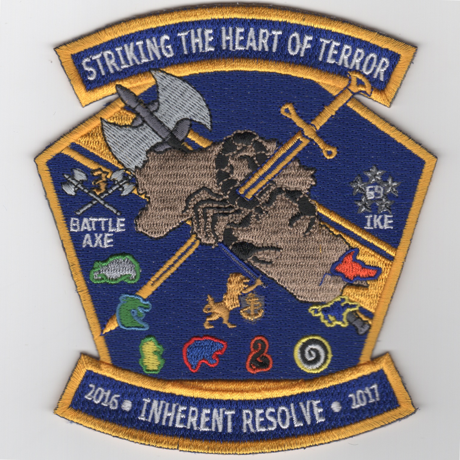 This is one of the 2016-2017 OIR cruise patches created by CVN-69/CVW-3 showing a black scorpion over Iraq. It has all the squadron emblems along the edge of the patch and says “”””STRIKING AT THE HEART OF TERROR”””” along the top. This patch does not come with velcro attached.