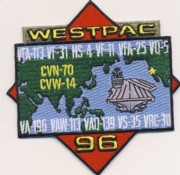 This is the diamond version of one of the USS Carl Vinson’s ’96 WestPac Cruise Patch. Attached squadrons were VAW-113, VA-196, VFA-113, VFA-25, VF-31, HS-4, VF-11, VS-35, and VAQ-139. This was the last A-6E Intruder cruise from the West Coast.