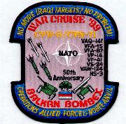 This is the cruise patch from the USS Theodore Roosevelt and Air Wing 8 back in ’99 during the Kosovo Crisis. This one denotes the fact that even though the Iraqi targets were few and far between, the Balkans provided an ample supply. This is one of 6 of the CVN-71/CVW-8 Kosovo Crisis Cruise patches in 1999.