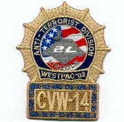 CVW-14 aboard the USS Lincoln (CVN-72) just completed their Western Pacific cruise where they were involved in operations in the Persian Gulf (Operation Southern Watch), and Indian & Pacific Oceans. This is the cruise patch for the 2002 Cruise. It denotes their mission….Anti-Terrorist Division.