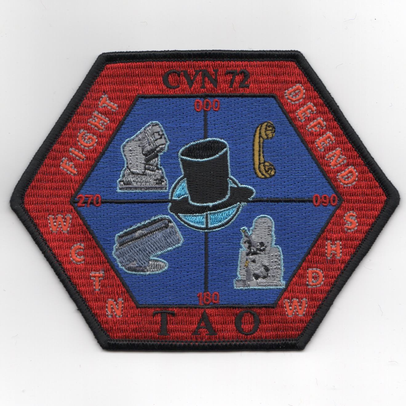 (Obtained from their supplier): This is a ‘cruise’ patch created by the TAO Department (Tactical Action Officer) showing a different threats with the crosshairs on VFA-14 ‘TOPHAT’! It says “FIGHT”, “DEFEND”, “WCTN”, and “SHDW”, which I’m sure there is one HELLUVA story behind this!! This patch does not come with velcro attached!