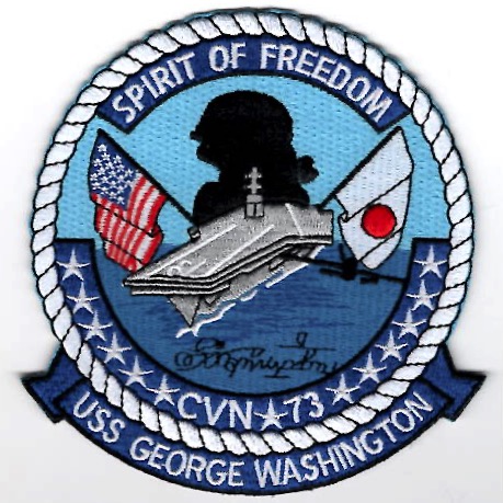 (Another AV8RSTUFF Creation): The “GW” was commissioned on 04 July 1992 and has served the Atlantic Fleet during her tenure. She is named after the founding father and carries the nickname “The Spirit of Freedom”. She saw the VA-34 Blue Blasters on their last deployment in 1996 and has since done a “quick turn” to accomodate CVW-17 which is home-based at NAS Oceana, VA. The USS Washington is home-ported at NAS Norfolk, VA. This version of the ship patch shows the AMERICAN and JAPANESE Flags, and does not have velcro attached.