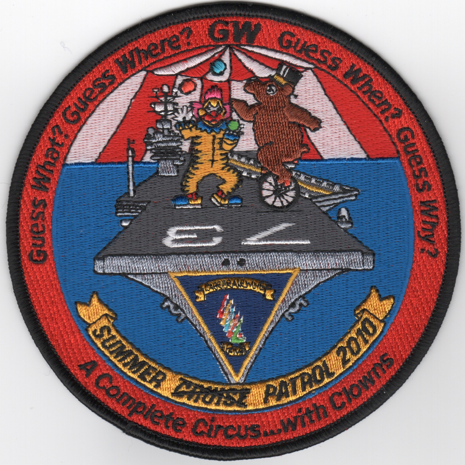 This is the cruise patch created for CVN-73/CVW-5 for their 2010 Summer “”””Patrol”””” (CRUISE is marked through). It says “”””A Complete Circus…with Clowns”””” along the bottom and shows a clown and dancing bear on the flight deck.