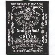 This is the cruise patch created for CVN-73/CVW-7/VF-11 “”””Red Rippers”””” for their 2004 Arabian Gulf Cruise. It also lists all the other squadrons that were on that boat. It has the familiar shape and design of the “”””Jack Daniels Black Label”””” found on the unofficial beverage of choice.