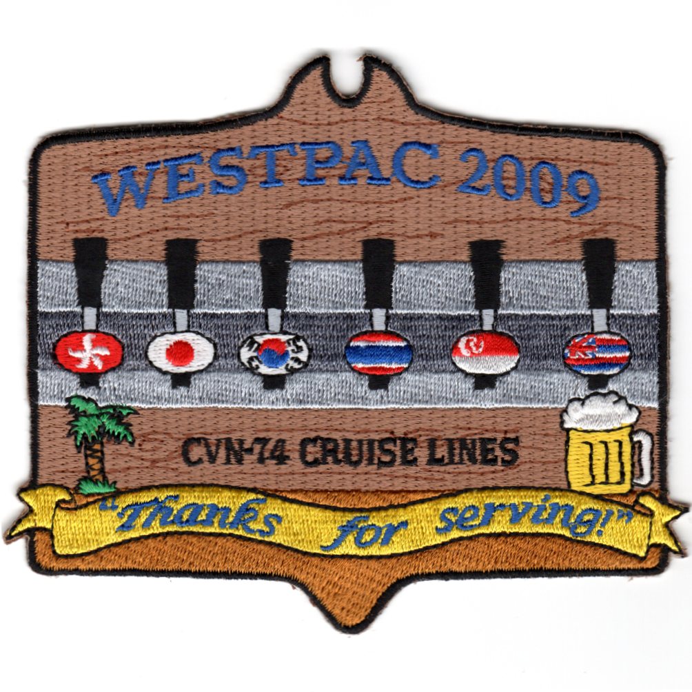 This is one of the cruise patches we bought from the squadron that was created for CVN-74 and their Airwing for the 2009 WESTPAC Deployment. It says “”””CVN-74 CRUISE LINES – THANKS FOR SERVING””””. It shows a bar with beer taps that have all the flags of the countries they visited. This patch does not come with velcro attached.