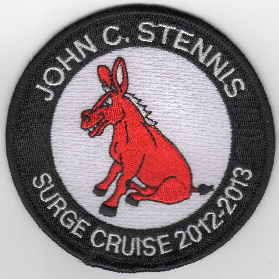 This is one of the 2012-2013 cruise patches for the USS John C. Stennis (CVN-74) for their 2013 Med cruise. It’s says “”””SURGE CRUISE”””” along the bottom with a “”””red jackass””””(?) smiling…..