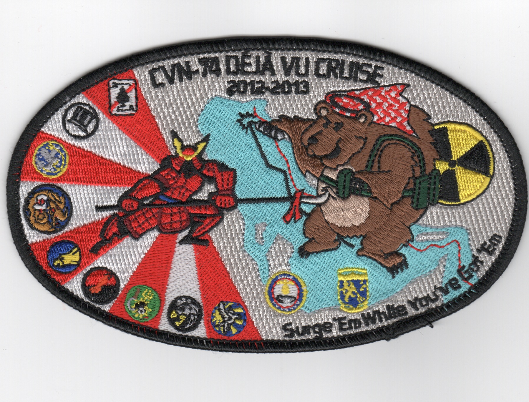This is one of the 2012-2013 cruise patches created by VFA-192 World Famous Golden Dragons while attached to the USS John C. Stennis (CVN-74) for their 2013 Med cruise. It’s says “”””DEJA VU CRUISE”””” across the top and “”””SURGE EM WHILE YOUVE GOT EM”””” across the bottom with all the squadron’s insignias. This patch does not have velcro attached.