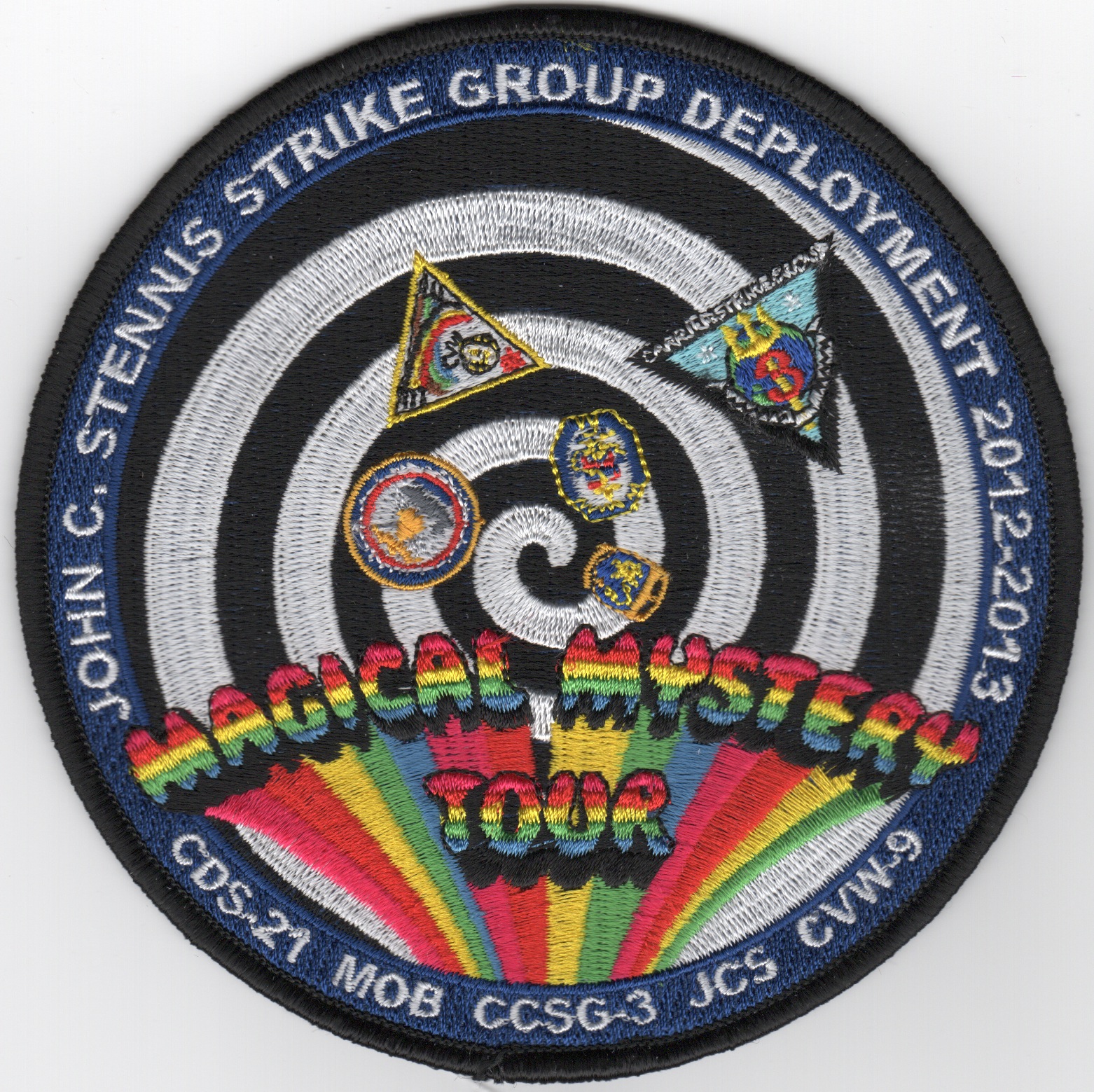 This is one of the 2012-2013 cruise patches for the USS John C. Stennis (CVN-74) for their 2013 Med cruise. It’s says “MAGICAL MYSTERY TOUR” in rainbow letters across the middle and “JOHN C. STENNIS STRIKE GROUP DEPLOYMENT 2012-2013” across the top, listing all the major commands in the Strike Group across the bottom.