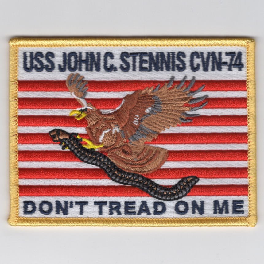 This is the color version of the famous “Don’t Tread on Me” flag worn on the flight suit sleeve by those who served onboard USS STENNIS (CVN-74). A few years ago, a directive from the US Navy was released that these are now an authorized flag that can be worn on their flight suits (unconfirmed). This patch does not come with velcro attached.