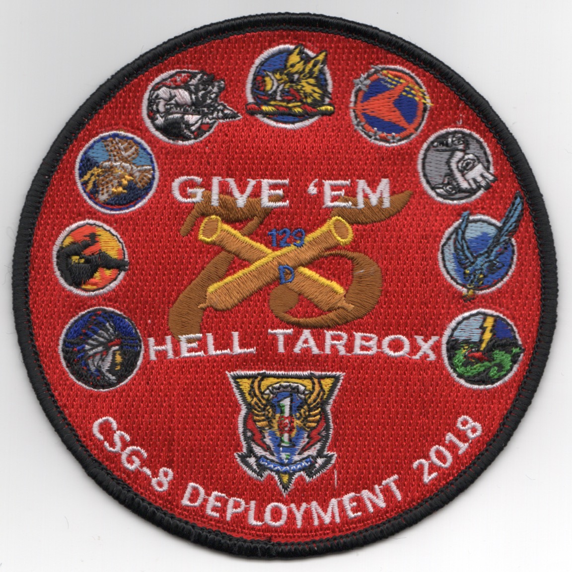(Obtained from the squadron supplier): This is one of the 2018 Cruise patches created for CVN 75/CVW-1 for their 2018 deployment. It says “GIVE EM HELL TARBOX” (middle), “CSG-8 DEPLOYMENT 2018” (bottom), and has all the squadron logos around the edge. This patch does not have velcro attached.