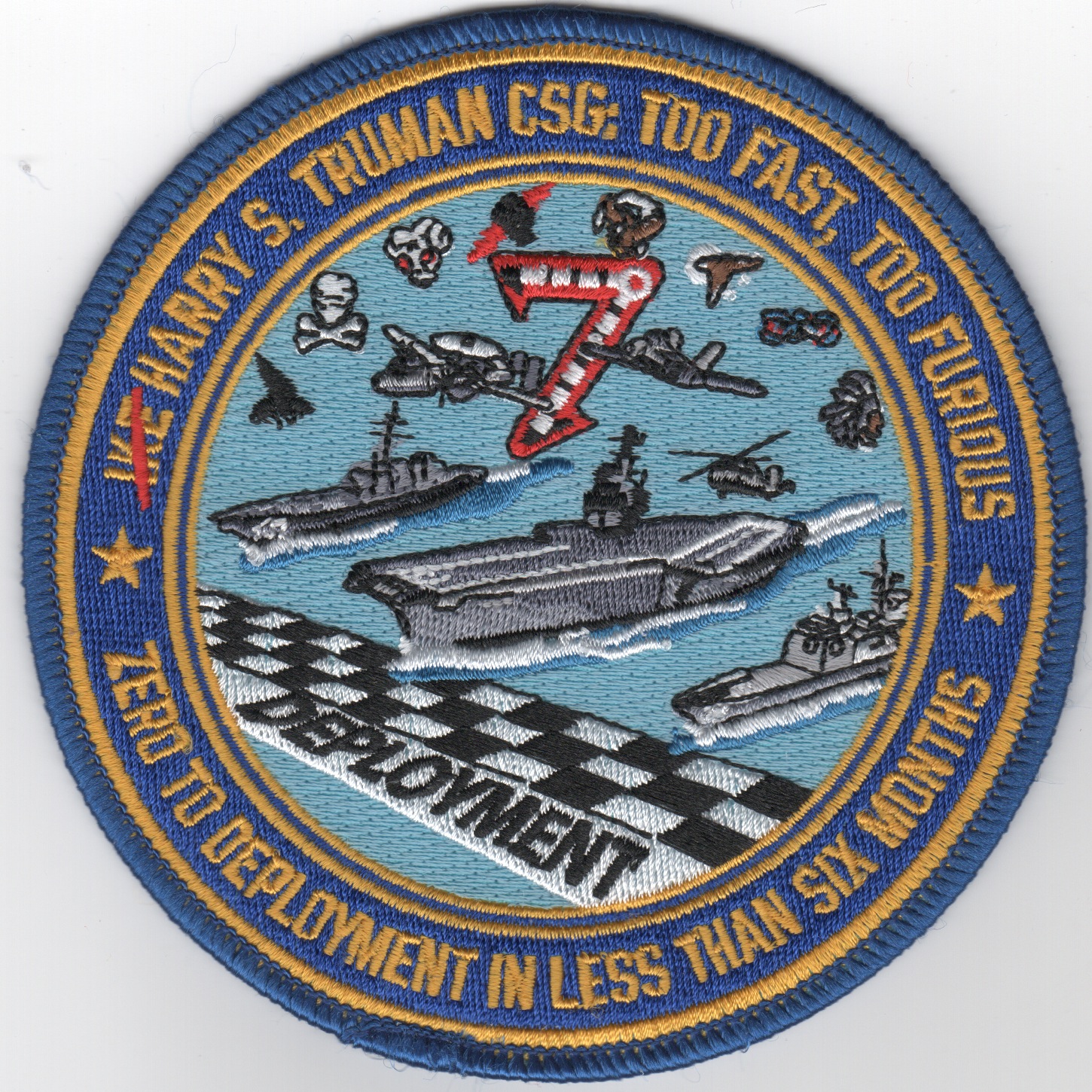 This is the USS Harry Truman (CVN-75)/CVW-7 “Too Fast, Too Furious” cruise patch. It says “ZERO TO DEPLOYMENT IN LESS THAN SIX MONTHS” along the bottom. This patch does not have velcro attached.