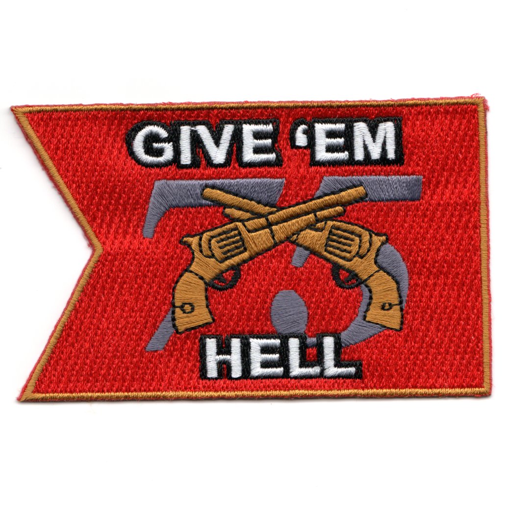 This is the CVN-75 “”””GIVE ‘EM HELL”””” red-pennant version with the YELLOW border and the “”””chevron”””” on the LEFT side of the patch showing the crossed PISTOLS. This patch does not have velcro attached.