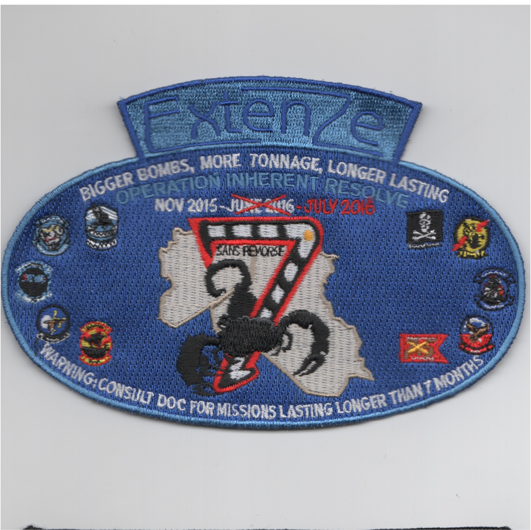 This is the blue, oval-shaped 2016 OIR cruise patch for CVN-75/VFA-143/CVW-7 showing a black scorpion over Iraq. It has the “gaggle” of squadron emblems around the edges and says “BIGGER BOMBS, MORE TONNAGE, LONGER LASTING” along the top with “EXTENZE” at the very top, and is “blue”, the same color as “that little blue pill”. Working with VFA-143, we bought ALL their older cruise patches to help their “Mess”. Very detailed patch, pretty neat idea of “breaking the glass”. This patch does not have velcro attached.