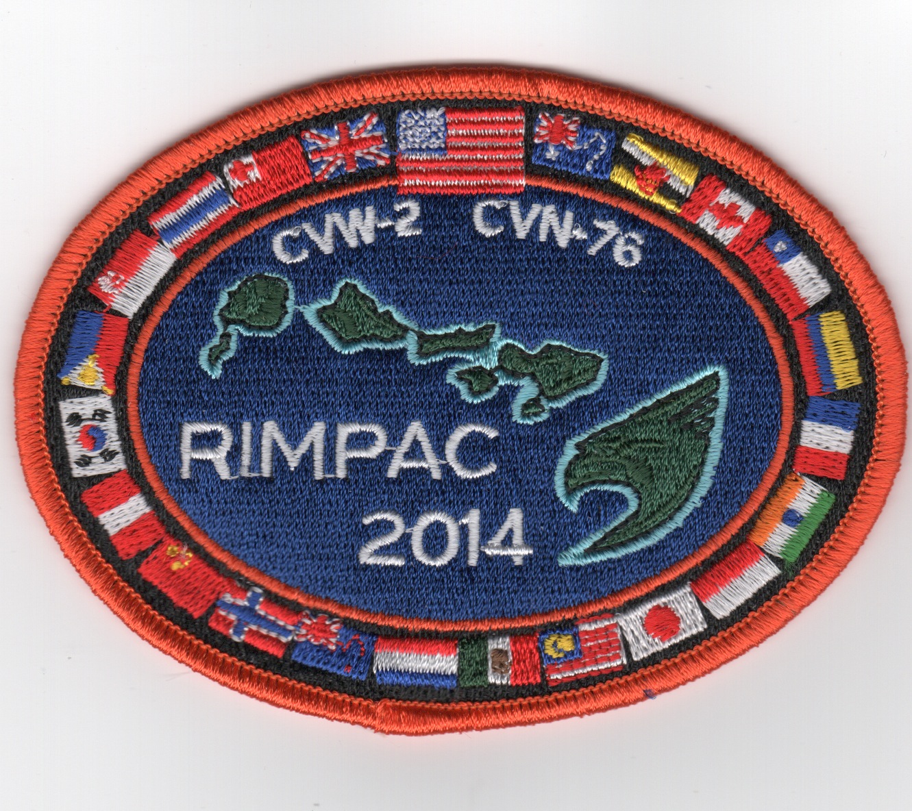 This is one of the cruise patches created by CVN-76 and AIRWING 2 for their 2014 ‘RIMPAC’ deployment. It shows the flags of many countries along the edges.
