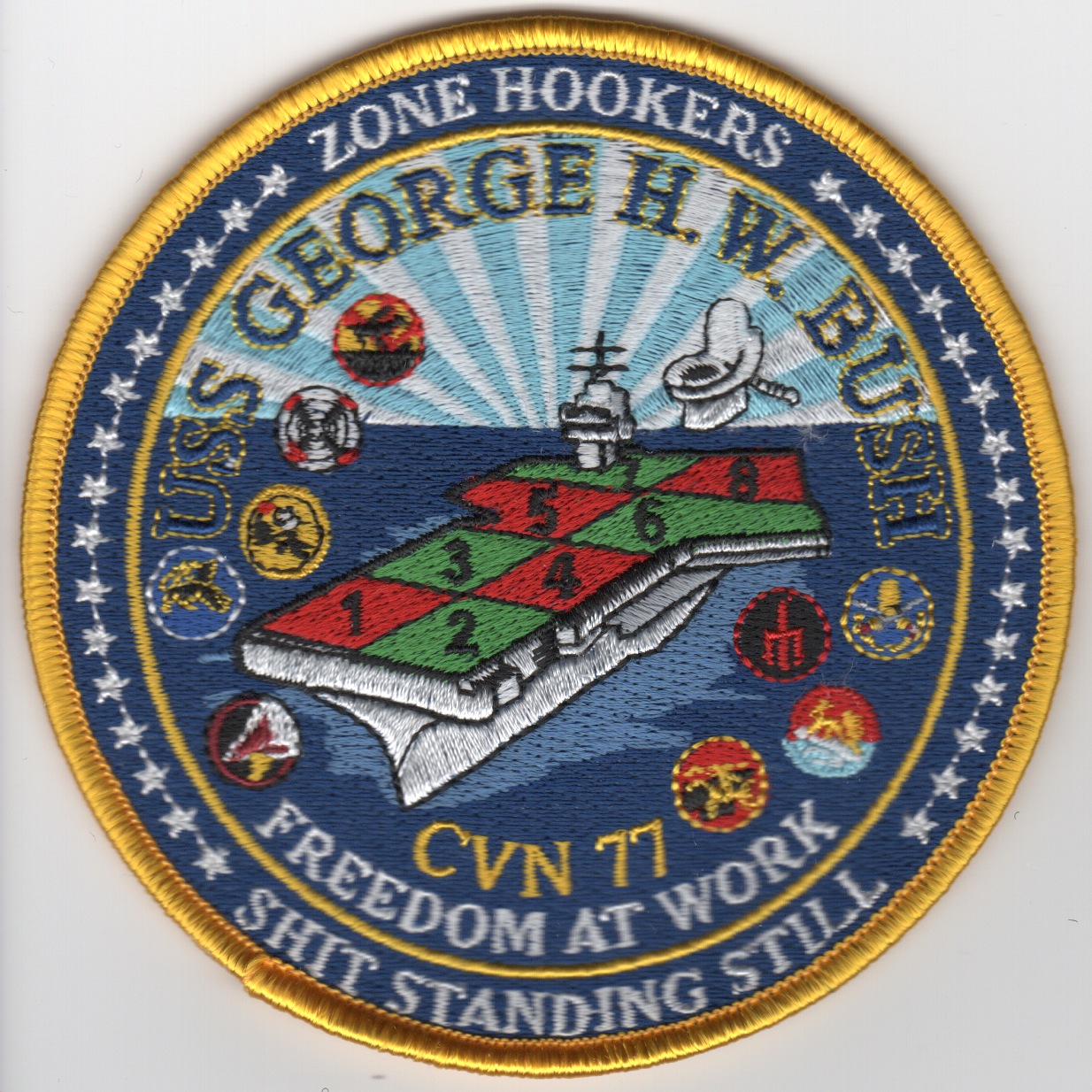 This is the “Zone Hookers” patch for the USS George H. W. Bush (CVN-77) Aircraft Carrier. It shows the flight deck divided into 8 ‘zones’ and says “SHIT STANDING STILL” along the bottom. It also shows a toilet with the hook down on final, so I’m sure there’s an “interesting” story behind this. Picked these up from the boat and they do not have velcro.
