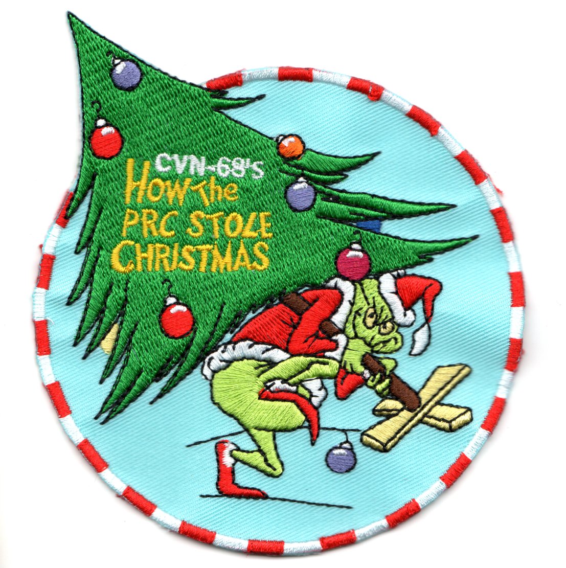 (Another AV8RSTUFF Creation): This patch was created for CVW-17 and CVN-68 since they were deployed and underway over the 2022 Christmas Holidays. It used the famous Dr. Seuss’ *GRINCH*, showing him stealing the Christmas Tree which says “HOW THE PRC STOLE CHRISTMAS” (not sure of the backstory on this one). This patch was created to commemorate that event and does NOT come with velcro attached.