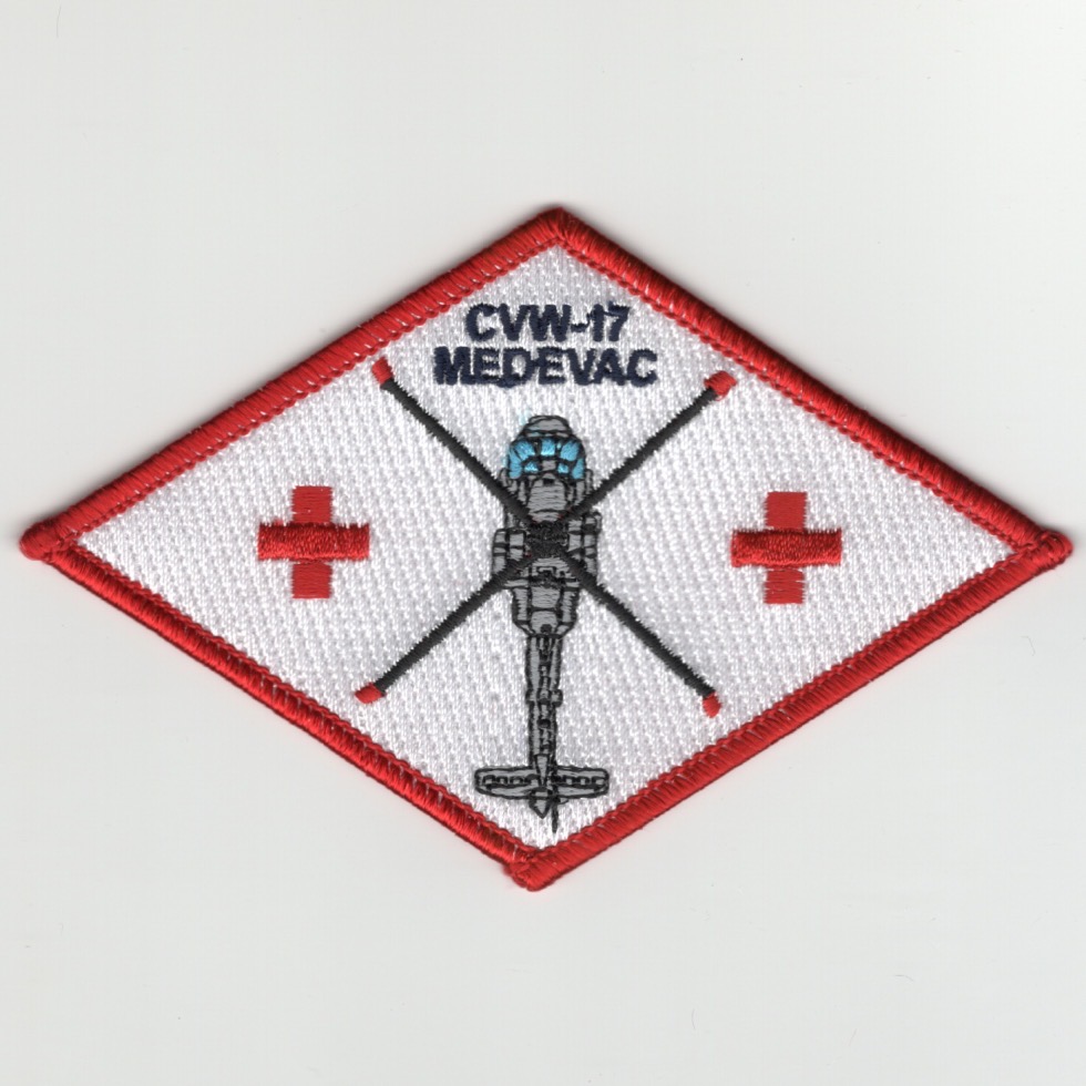 Carrier Air Wing Seventeen (CVW-17) is a U.S. Navy strike fighter wing based at NAS Lemoore, CA, typically attached to Carrier Strike Group 11 (CSG-11) and the USS Nimitz (CVN 68). It consists of nine squadrons, including F/A-18E/F Super Hornets, electronic warfare, and aerial logistics units, designed for maritime superiority, power projection, and combat operations. This is the white version of their MEDEVAC diamond patch that says “MEDEVAC” and does not have velcro attached.