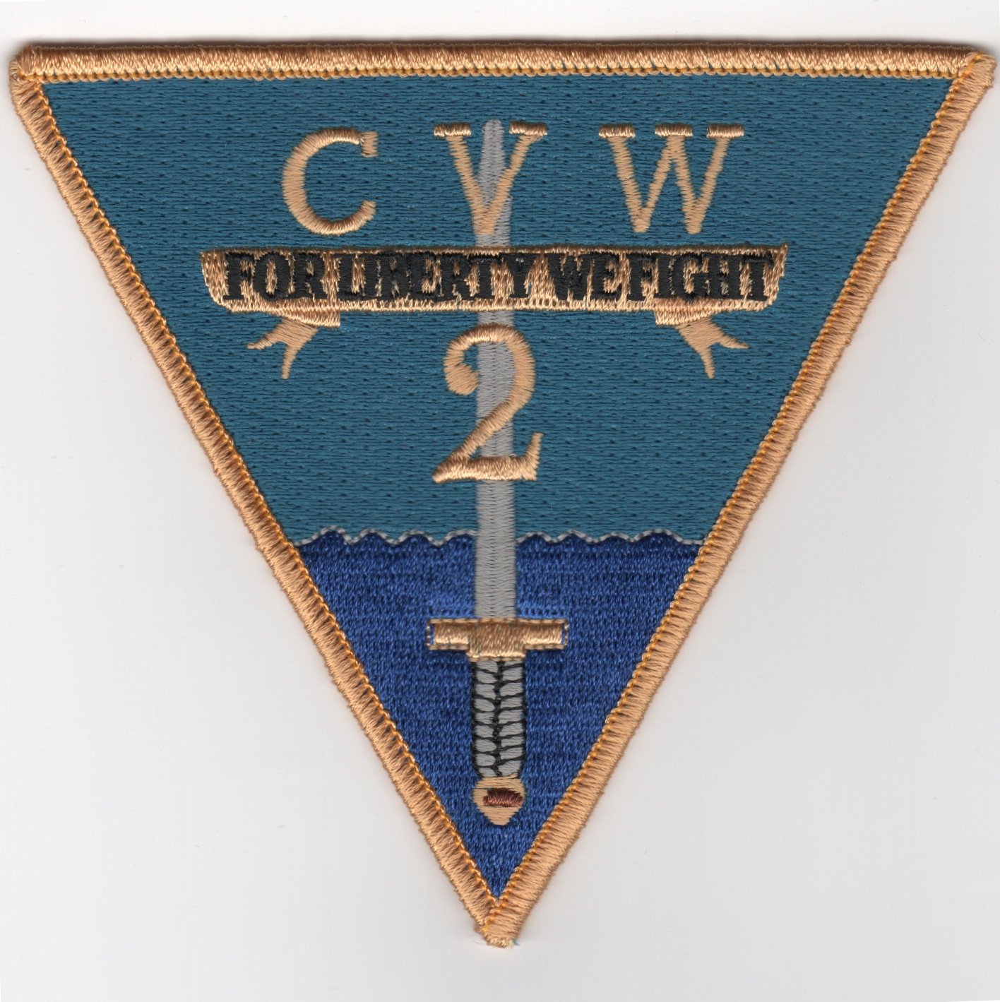 This is the Carrier Airwing Two (CVW-2) triangular patch that says “FOR LIBERTY WE FIGHT”. This version has the desert border and desert letters, but with a dark blue background. This patch does not come with velcro attached.