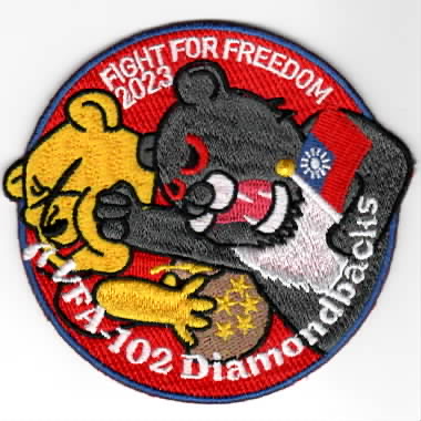 (Another AV8RSTUFF Creation): This is one of the 2023 *FIGHT FOR FREEDOM* WESTPAC Cruise patches created for Carrier Air Wing Five (CVW-5) and the VFA-102 ‘DIAMONDBACKS’. It shows the Taiwanese Panda holding their country’s flag and punching the Chinese ‘Winnie-The-Pooh’ mascot, meaning that Taiwan is defending itself (along with the US Navy’s support). This patch does not have velcro attached.