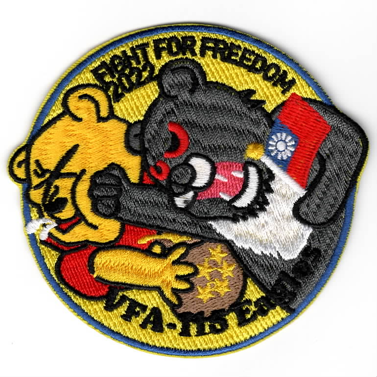 (Another AV8RSTUFF Creation): This is one of the 2022 *FIGHT FOR FREEDOM* WESTPAC Cruise patches created for Carrier Air Wing Five (CVW-5) and the VFA-115 ‘EAGLES’. It shows the Taiwanese Panda holding their country’s flag and punching the Chinese ‘Winnie-The-Pooh’ mascot, meaning that Taiwan is defending itself (along with the US Navy’s support). This patch does not have velcro attached. Note the 2023 version is above!!