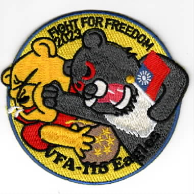 (Another AV8RSTUFF Creation): This is one of the 2023 *FIGHT FOR FREEDOM* WESTPAC Cruise patches created for Carrier Air Wing Five (CVW-5) and the VFA-115 ‘EAGLES’. It shows the Taiwanese Panda holding their country’s flag and punching the Chinese ‘Winnie-The-Pooh’ mascot, meaning that Taiwan is defending itself (along with the US Navy’s support). This patch does not have velcro attached. Note the 2022 version is below!!