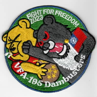 (Another AV8RSTUFF Creation): This is one of the 2023 *FIGHT FOR FREEDOM* WESTPAC Cruise patches created for Carrier Air Wing Five (CVW-5) and the VFA-195 ‘DAMBUSTERS’. It shows the Taiwanese Panda holding their country’s flag and punching the Chinese ‘Winnie-The-Pooh’ mascot, meaning that Taiwan is defending itself (along with the US Navy’s support). This patch does not have velcro attached.