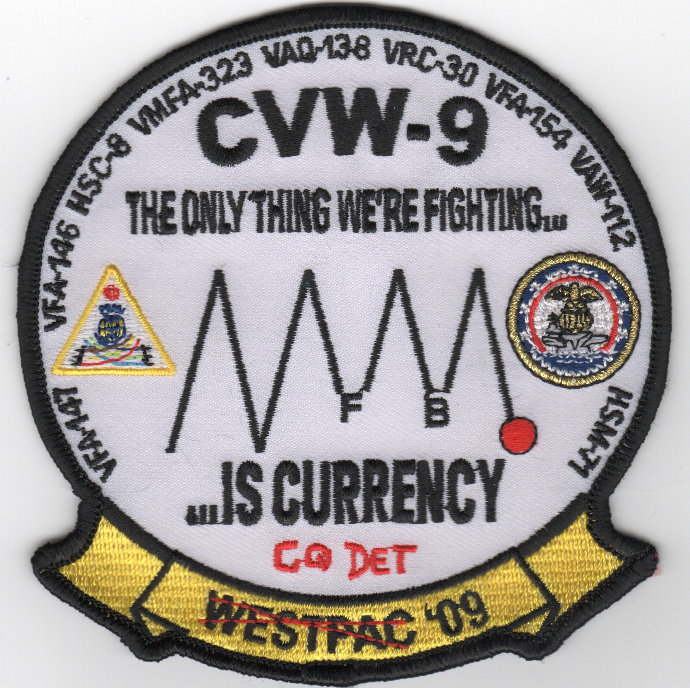 This patch was created for the CVW-9 2009 WESTPAC Cruise. It says “”””The Only Thing We’re Fighting is Currency””””!!
