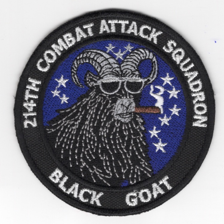 The 214th Attack Squadron (214 ATKS) is a unit of the Arizona Air National Guard’s 214th Attack Group located at Davis-Monthan Air Force Base, Tucson, Arizona and is operationally gained by the Air Combat Command (ACC). The 214th is equipped with the General Atomics MQ-9 Reaper. Arizona Air National Guard Predator operations will first fill worldwide theater requirements but will also likely evolve into providing direct defense for the homeland in conjunction with the Department of Homeland Security and U.S. Northern Command. A permanent facility located at Davis-Monthan Air Force Base was completed 2009. This is their shoulder “bullet” patch that shows the “GOAT” smoking a cigar and does not come with velcro attached.