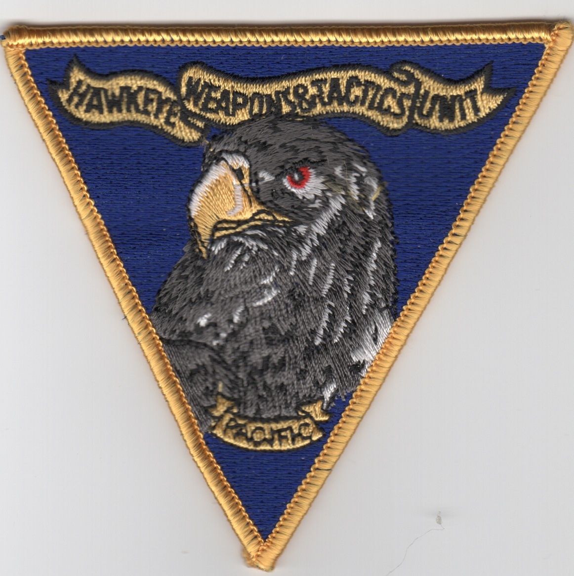 This is the triangular version of the E-2C Hawkeye Weapons & Tactics Unit (WTU) school operated on the West Coast (ie, Pacific). It shows the Hawkeye head on the patch……