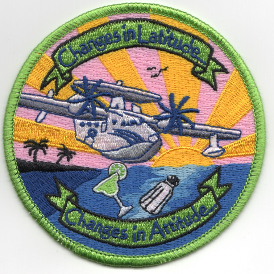 This is one of the DETACHMENT patches from the VAW community. It depicts the new E-2D aircraft as a ‘seaplane’ (note the underside belly of the aircraft) and says “CHANGES IN LATITUDE, CHANGES IN ATTITUDE”. Not sure which squadron it is from, but looks like they had a damn good TDY! This patch does not have velcro attached.
