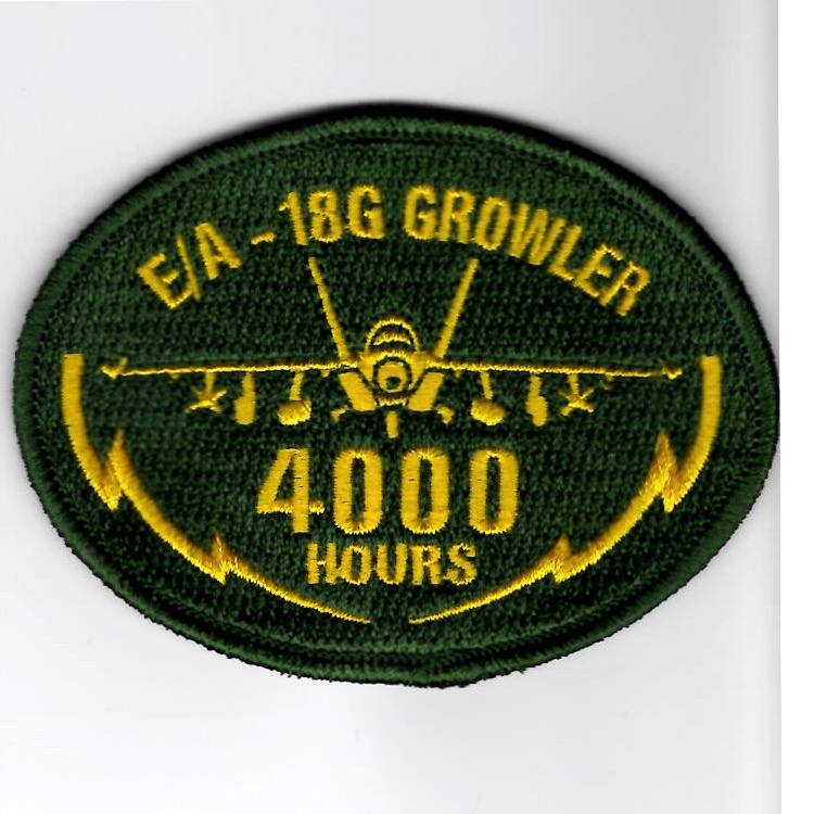 This is the ‘green’ version (with the green border) of the E/A-18G GROWLER *4000 HOURS* Oval patch for those who have reached this milestone with the number of hours in the aircraft. This version of the patch does NOT come with velcro attached.