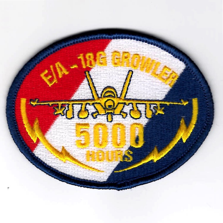 This is the ‘red-white-blue’ version (with the blue border) of the E/A-18G GROWLER *5000 HOURS* Oval patch for those who have reached this milestone with the number of hours in the aircraft. This version of the patch does NOT come with velcro attached.