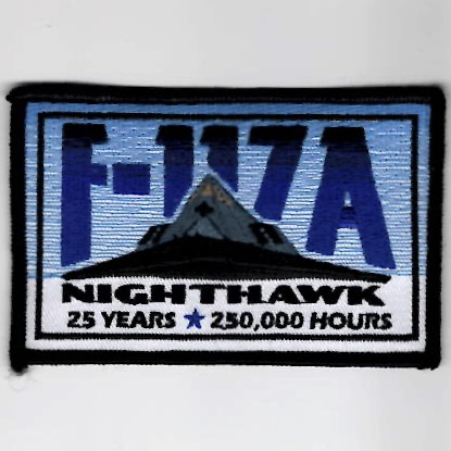 The Lockheed F-117 *Nighthawk* is a retired American single-seat, subsonic, twin-engined, stealth attack aircraft developed by Lockheed’s secretive Skunk Works division and operated by the USAF. It was the first operational aircraft to be designed with stealth technology. This patch was created to celebrate 25 YEARS of service and 250,000 HOURS of operations and does not come with velcro attached.