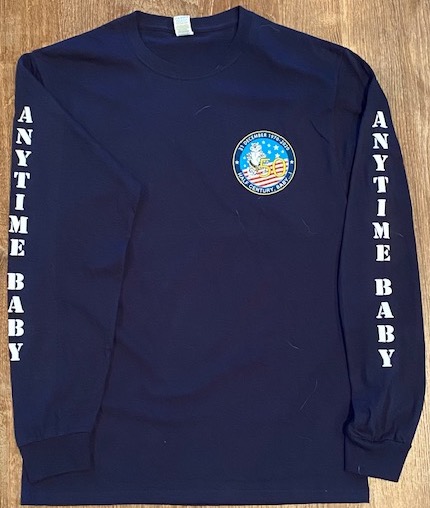(Another “HEY JOE” Creation): This is the blue version of the F-14 Tomcat Association, in cooperation with “HEY JOE” productions, T-shirt celebrating the 50th Anniversary of the greatest US Navy Fighter (front) and the ‘score’ between the F-14 Tomcat (4 Kills) vs. the Libyan MiG fighters (0). It says “Anytime, Khadafy Baby” (back bottom), “Anytime, Baby” (left sleeve), and “Anytime, Baby” (right sleeve). Only have a few in each of the sizes listed above, so get them while they last in time for Christmas!! I have ONE in “tan” in the MEDIUM size…..first to ask for it gets it. Also, you can put your requested size in the “COMMENTS” section at checkout.
