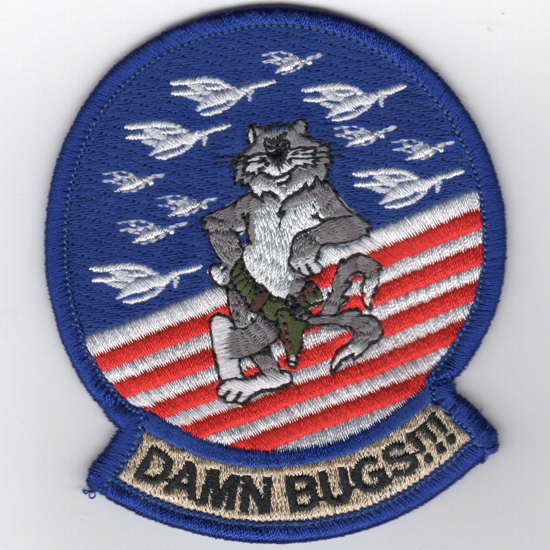This is one of the many “”””transition”””” patches created for the Tomcat squadrons that went to Hornet squadrons. This one shows Felix being “”””buzzed”””” by all the new Hornets and says along the bottom DAMN BUGS!!!.