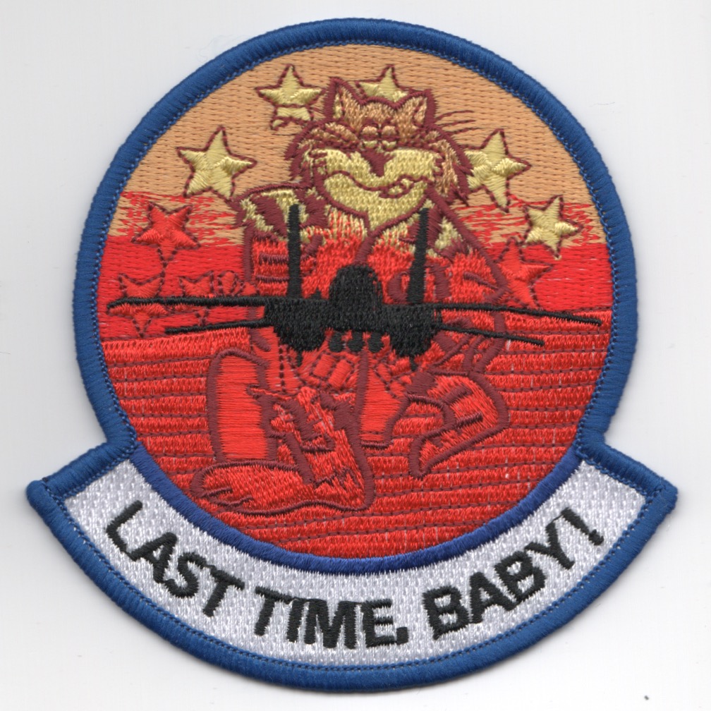 This is the commemmorative “FELIX” patch created for the Tomcat Association as the venerable F-14 Tomcat was decommissioning. It depicts the standard felix patch with setting sun colors and says “LAST TIME, BABY” along the bottom. This patch does not come with velcro attached.